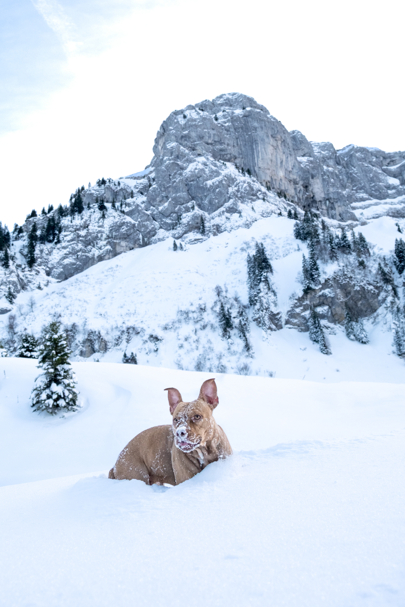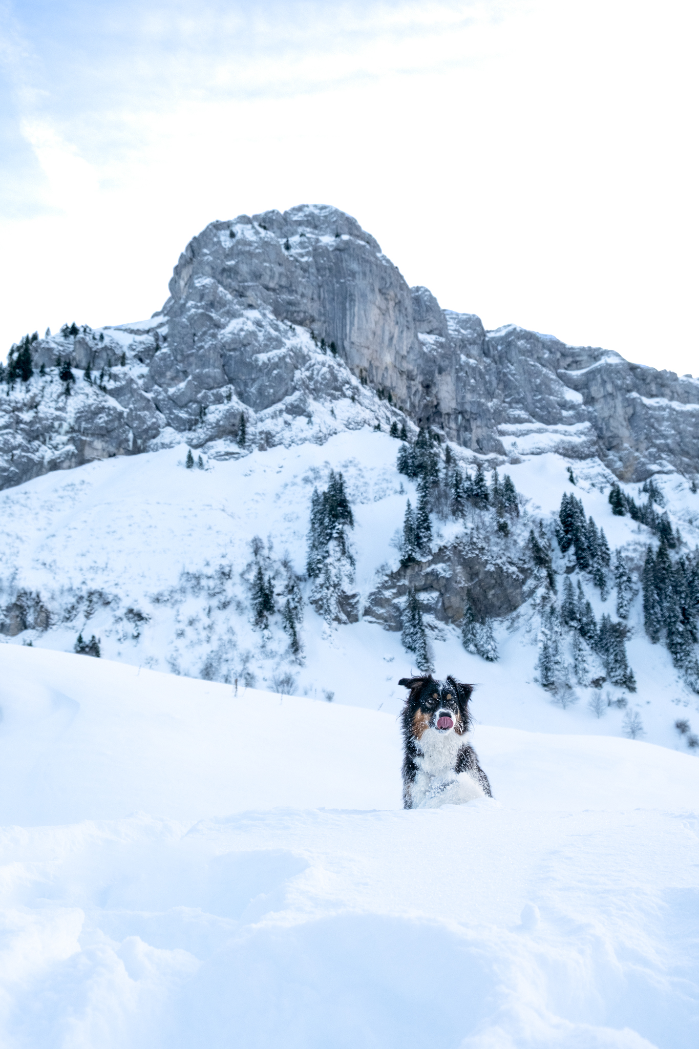 Vallia, un border collie, qui joue à courir dans la neige en haute savoie, lors d'une promenade à bellevaux