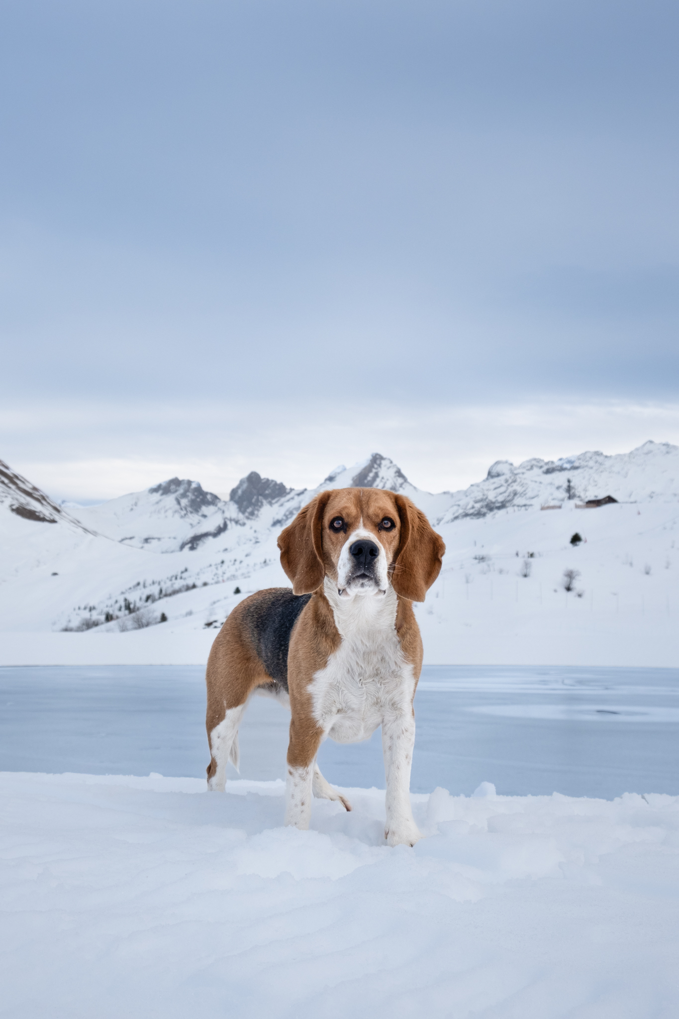 Séance photo de chien à Bellevaux en Haute Savoie. Photographe professionnelle spécialisée famille, grossesse et animalier. Shooting de malinois, duo maître/chien avec complicité au bord du lac de Vallon gelé avec de la neige.